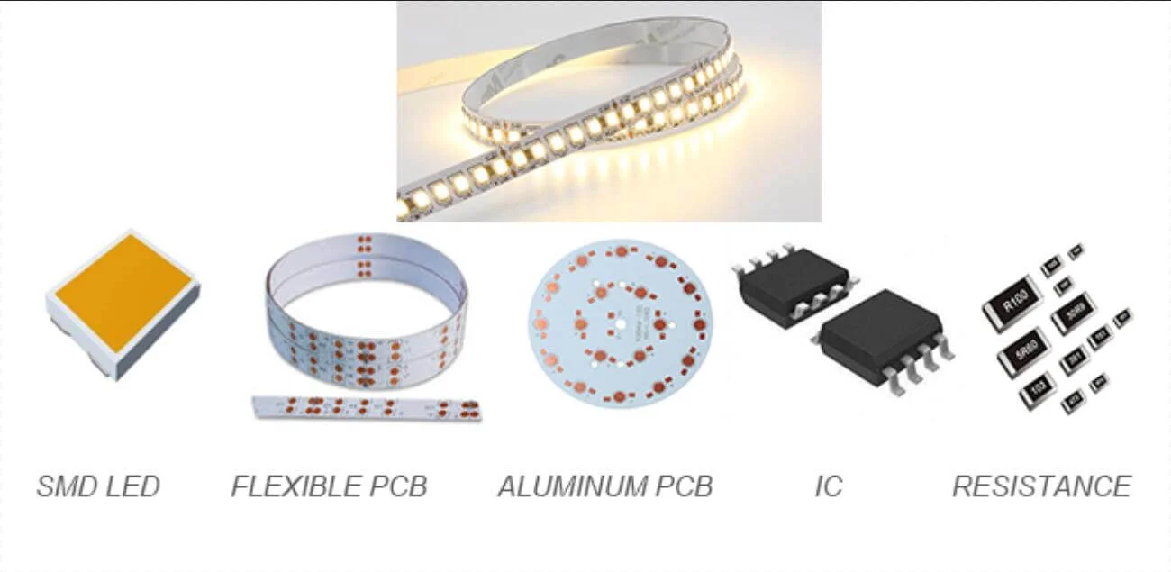 نوار LED از تراشههای LED، برد مدار چاپی (FPCB، آلومینیومی یا FR-4)، مقاومت، خازن، آیسی، پوشش سیلیکونی یا PVC، نوار چسب 3M و سیم تشکیل میشود.